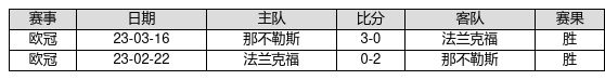 那不勒斯 VS 法兰克福两队近10年的交战次数为2场,那不勒斯2胜0平0负,赢球概率为100.0%,平局概率为0.0%,输球概率为0.0%。