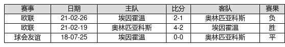 奥林匹亚科斯 VS 埃因霍温两队近10年的交战次数为3场,奥林匹亚科斯1胜1平1负,赢球概率为33.3%,平局概率为33.3%,输球概率为33.3%。