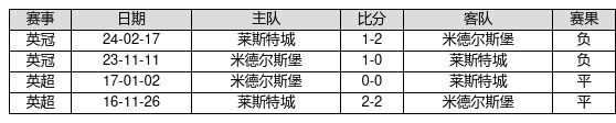 莱斯特城 VS 米德尔斯堡两队近10年的交战次数为4场,莱斯特城0胜2平2负,赢球概率为0.0%,平局概率为50.0%,输球概率为50.0%。