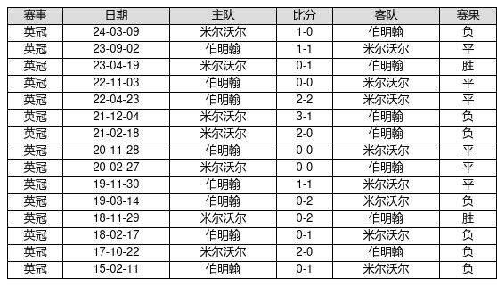 伯明翰 VS 米尔沃尔两队近10年的交战次数为15场,伯明翰2胜6平7负,赢球概率为13.3%,平局概率为40.0%,输球概率为46.7%。