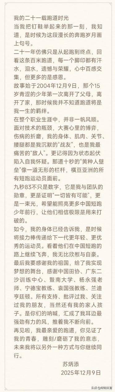 12月9日,苏炳添通过粗鲁平台发布长文,厚爱宣警戒指工作生存,为漫长的奔波岁月画上句号。